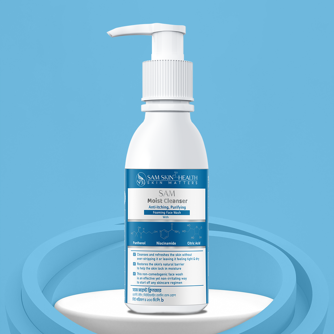 SAM Moist Cleanser is a dermatologist-approved, ultra-gentle foaming cleanser designed to hydrate, soothe, and protect dry, sensitive, and irritated skin. Enriched with Panthenol, Niacinamide, and Citric Acid, this soap-free, pH-balanced formula ensures a deep yet gentle cleanse, removing dirt, impurities, and pollutants without stripping away essential moisture. Unlike harsh cleansers, it helps to restore the skin’s natural barrier, reduce itchiness, and prevent tightness or discomfort.